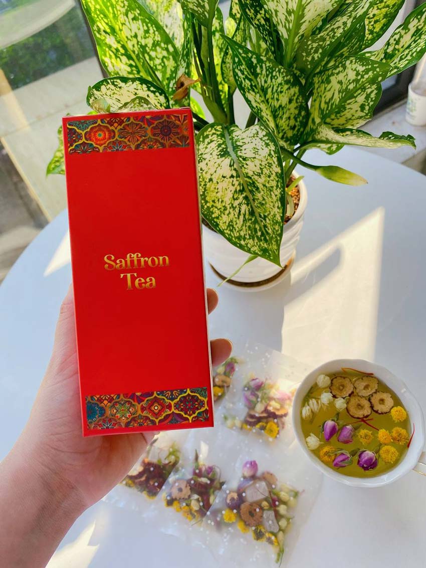 Nhụy hoa nghệ tây là thảo dược quý hiếm và vô cùng đắt đỏ, được mệnh danh là “Vàng đỏ Trung Đông”, kết hợp với set trà Saffron Tea, bên trong gồm các loại trà hoa, táo đỏ đem đến nhiều lợi ích cho sức khỏe và sắc đẹp như: