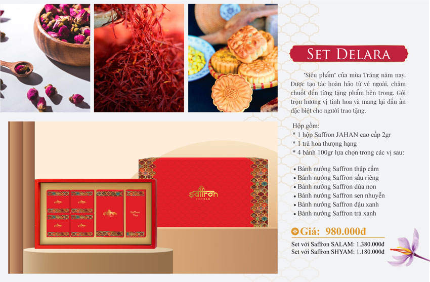 Không chỉ có Nhụy hoa nghệ tây quý giá, set quà Delara #2 của Quà tặng Saffron còn có tặng phẩm mới rất độc đáo: Bánh Trung thu Saffron. Lần đầu tiên sự kết hợp mĩ vị giữa bánh nướng truyền thống Việt Nam, cùng loại thảo mộc thiên nhiên quý giá “vàng đỏ” của Trung Đông. Hương vị bánh nướng tuyệt hảo cho một đêm trăng tròn.